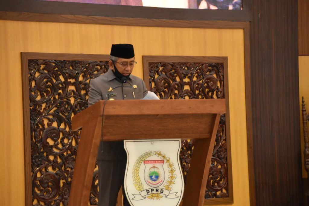 BANNIQ.Id. Sulbar | Gubernur Sulbar Ali Baal Masdar, memberikan penjelasan tentang pertanggungjawaban pelaksanaan APBD tahun Anggaran 2019 yang dirangkaikan dengan Penyerahan Ranperda oleh Gubernur Sulbar Ali Baal Masdar kepada Ketua DPRD Provinsi Sulbar Suraidah Suhardi dalam Rapat Paripurna DPRD Provinsi Sulbar, Kamis 2 Juli 2020.