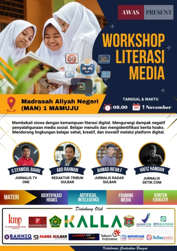 BANNIQ.Id. Mamuju. – Aliansi Wartawan Sulbar (AWAS) sukses menggelar Workshop Literasi Media yang diikuti Siswa-siswi MAN 1 Mamuju, Sabtu, 1 November 2025.
