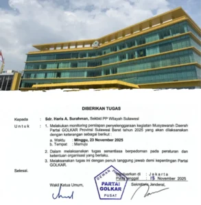 BANNIQ.Id. Sulbar. DPP Partai Golkar Kembali menerbitkan Surat Nomor 33 /DPP/GOLKAR/XI/2025 tentang Surat Tugas kepada Haris A Surahman Sekbid PP Sulawesi untuk Memonitoring Pelaksanaann Musda