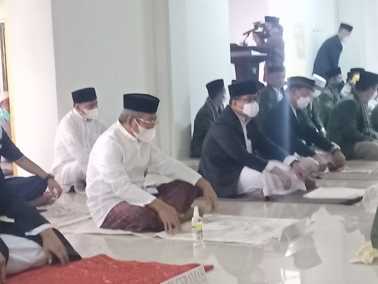 BANNIQ.Id.Sulbar.Pelaksanaan shalat Hari Raya Idul Fitri 1442 Hijriah, di Masjid Baitul Anwar Kompleks Perkantoran Gubernur Sulbar, dihadiri Gubernur Sulbar,Drs.HM Alibaal Masdar,M.Si, bersama Istri,Drs.Hj Andi Ruskati Alibaal, Sekprov Sulbar Dr.Mih.Idris Bersama Ibu Prof.Dr.Kartini Hanafi dan Pimpinan OPD Lingkup Pemprov Sulbar, Kamis(13/5/2021). Pengurus Masjid Baitul Anwar menerapkan Prokes bagi setiap jemaah shalat Ied seperti penggunaan masker, pengukuran suhu tubuh, Pembagian Handsanitizer ke setiap jemaah dan pengaturan jarak antar jamaah.