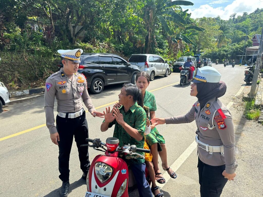 Selamat pagi, Mohon maaaf mengganggu perjalanannya bapak/ibu, sapa hormat kedua petugas tersebut, Rabu (22/5/24) di sekitar kota Mamuju.