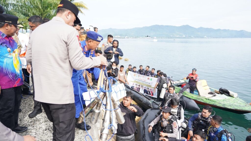 Kapolda Sulbar Irjen Pol Adang Ginanjar bersama Pj Gubernur Sulbar dan Forkopimda lainnya terlihat menebar Rumpon buatan di pantai Mamuju, Sabtu (22/6/24).