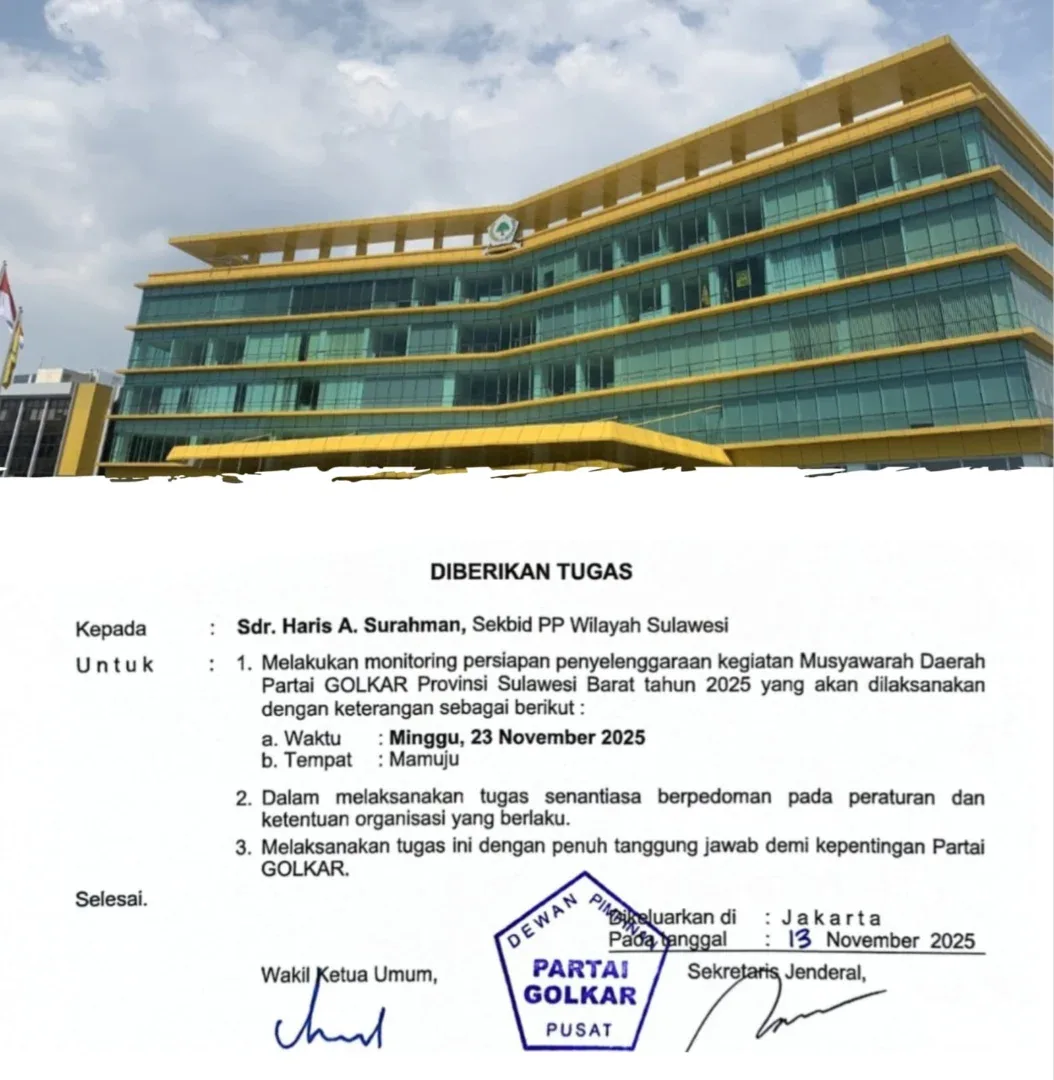 BANNIQ.Id. Sulbar. DPP Partai Golkar Kembali menerbitkan Surat Nomor 33 /DPP/GOLKAR/XI/2025 tentang Surat Tugas kepada Haris A Surahman Sekbid PP Sulawesi untuk Memonitoring Pelaksanaann Musda DPD Golkar yang dijadwalkan berlangsung tanggal 23 November 2025. Surat Tugas ini Ditandatangani Waketum DPP Partai Golkar Emanuel Melkiades Laka Lena dan Sekjen, Muhammad Sarmuji, tertanggal 13 November 2025.