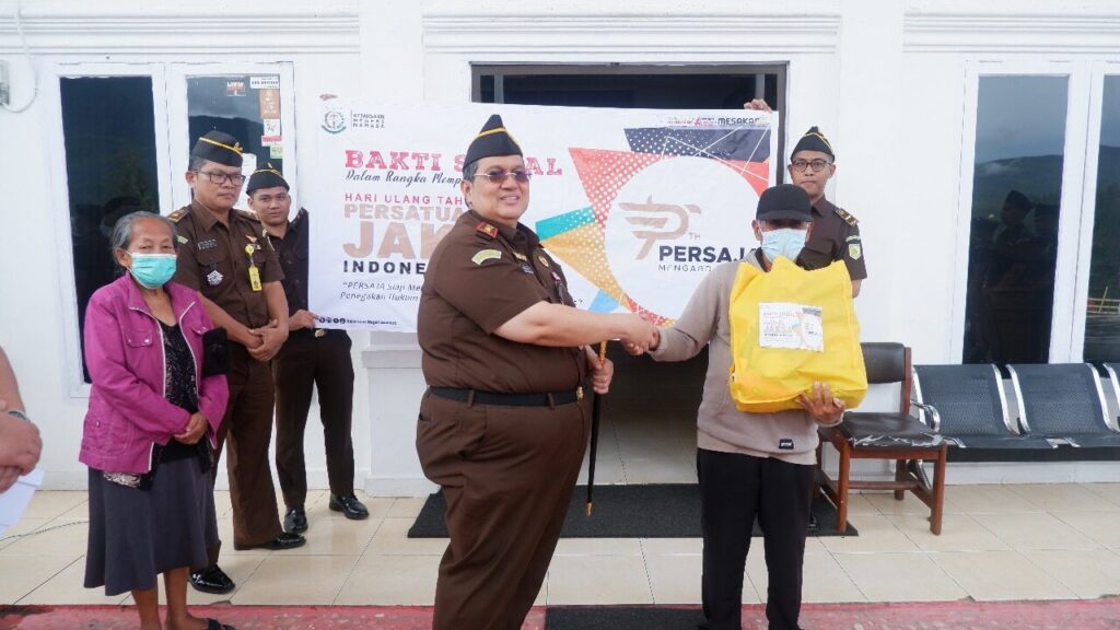 “Bakti sosial bertujuan agar setiap insan Adhyaksa, hadir di tengah-tengah masyarakat dan harus mampu menjadi teladan. Serta, dapat memberikan contoh yang baik bagi lingkungan dimana pun ia berada serta menunjukkan kejaksaan dekat dan merupakan bagian dari masyarakat,” ujar Musa. Ia berharap di usia 73 tahun Perjasa, para jaksa dapat menjadi penegak hukum yang profesional, berintegritas, berkepribadian, berdisiplin, memiliki etos kerja tinggi, penuh tanggung jawab, bermoral dan berhati nurani. HUT ke-73 Persaja Jaksa Diharapkan Lebih Profesional Kejaksaan Negeri Mamasa Momentum HUT Perjasa.|***