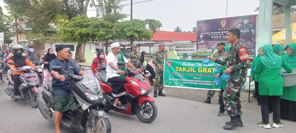 BANNIQ.Id, Pasangkayu— Tentara Nasional Indonesia Angkatan Darat (TNI-AD) jajaran Kodim 1427 Pasangkayu dalam hal ini Babinsa dan Persit Koramil 01 Pasangkayu gelar aksi sosial dengan berbagi takjil berbuka puasa kepada pengendara yang melintas di depan kantor Makoramil 01 Pasangkayu, jl Andi Depu, Kelurahan Pasangkayu, Kecamatan Pasangkayu, Kabupaten Pasangkayu, Provinsi Sulawesi Barat, Jum’at (07/04).
