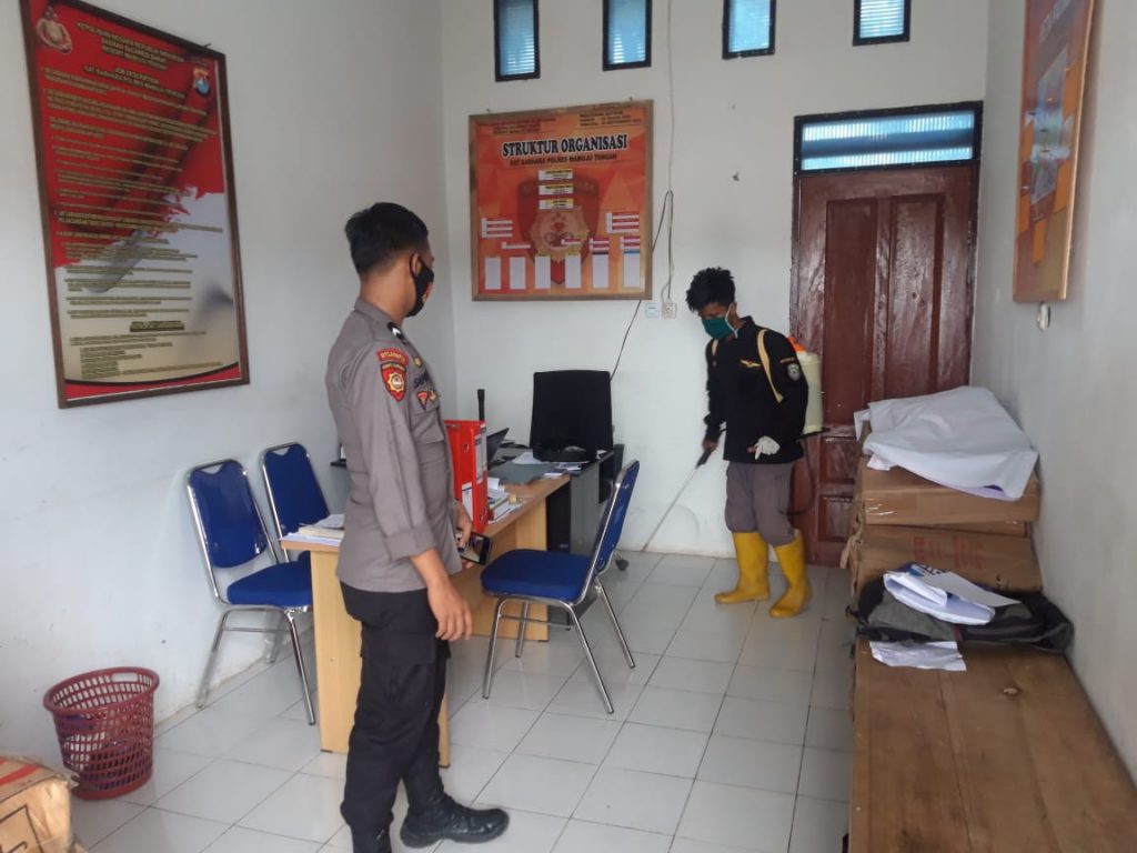BANNIQ.Id.Mateng.- Untuk mengantisipasi mewabahnya virus corona, personel Polres Mamuju Tengah (Mateng) dibantu anggota BPBD Kabupaten Mamuju Tengah, melakukan penyemprotan disinfektan di lingkungan mapolres Mateng, Selasa (03/11/2020)