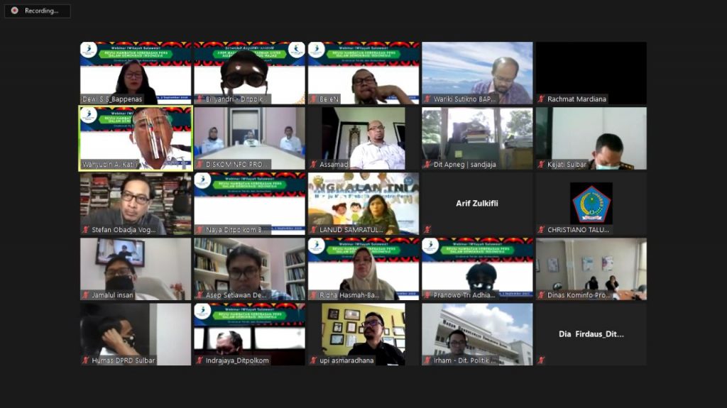 Gambaran Umum Webinar disampaikan oleh Wariki Sutikno( Direktur Politik dan Komunikasi Bappenas) Dimoderatori Dewi Sri Sotijaningsih, Co Moderator Bekti Nugroho, dengan Pemateri Airif Sulkifli(Anggota Dewan Pers) Upi Asmaradana,Pimred Kabar Makassar .com, Stefan Obaja Voges(Dosen Unstrat Menado), Kadis Kominfo Sulteng, dan Kadis Kominfo Provinsi Gorontalo, diikuti oleh puluhan Praktisi media dan Pemred Media se Sulawesi.
