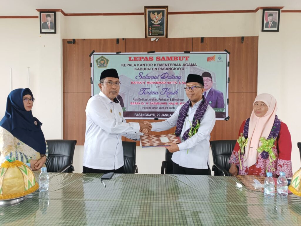 BANNIQ.Id. Pasangkayu. Jabatan Kepala Kantor Kementerian Agama (Kakan Kemenag) Kabupaten Pasangkayu berganti dari Pejabat Lama, Dr. H.Samsuri Halim ke Pejabat Baru, Muh.Hatta,S.Ag. Pergantian ini telah dilaksanakan melalui pelantikan yang dilaksanakan di Aula Kantor Kanwil Kemenag Sulbar oleh Kakanwil Kemenag Sulbar Dr.Syafruddin Baderung pekan lalu.