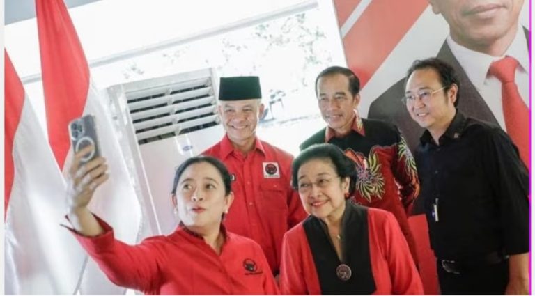 Dari foto yang beredar, Jumat (21/4/2023), Puan yang berseragam merah lengan panjang khas PDIP menjulurkan tangan kanannya yang sedang menggenggam ponsel, ke arah depan atas. Nampak Megawati di sebelahnya, sementara Jokowi, Ganjar, dan Prananda di belakang Puan dan Mega.