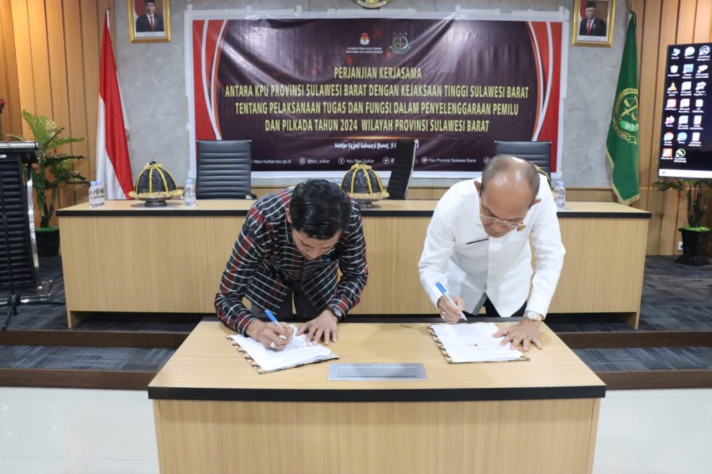 BANNIQ.Id. Sulbar. Menyongsong Pelaksanaan Pemilu tahun 2024, yang bukan hanya pesta demokrasi tetapi ajang untuk memilih para wakil rakyat baik eksekutif maupun legislatif, untuk proses pelaksanaannya diharapakan terlaksana secara aman damai dan berintegritas, maka untuk mewujudkan harapan tersebut Hari ini Rabu Tanggal 09 Agustus 2023 jam 14.00 Wita Kepala kejaksaan Tinggi (Kajati) Sulawesi Barat Drs Muhammad Naim, SH. di dampingi Asisten Perdata dan Tata Usaha Negara Kumaedi. SH., MH. bersama ketua KPU Provinsi Sulawesi Barat Said Usman Umar melakukan penandatanganan Perjanjian Kerja Sama/Memorandum of Undarstanding (MoU) antara Komisi Pemilihan Umum Provinsi Sulawesi Barat dengan Kejaksaan Tinggi Sulawesi Barat tentang Pelaksanaan Tugas dan Fungsi dalam Penyelenggaraan Pemilu dan Pilkada Tahun 2024 Wilayah Provinsi Sulawesi Barat.